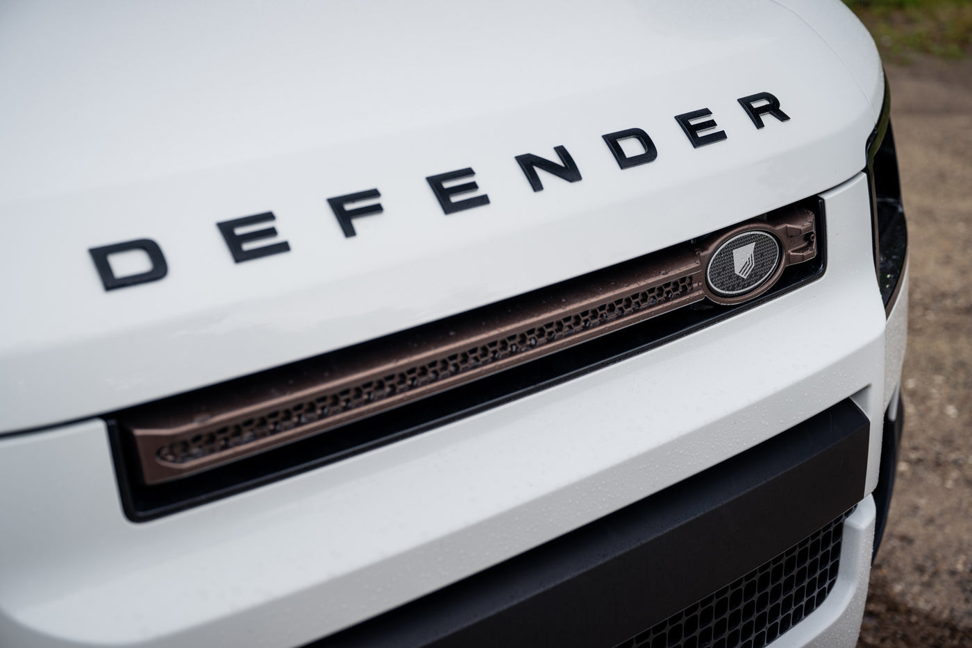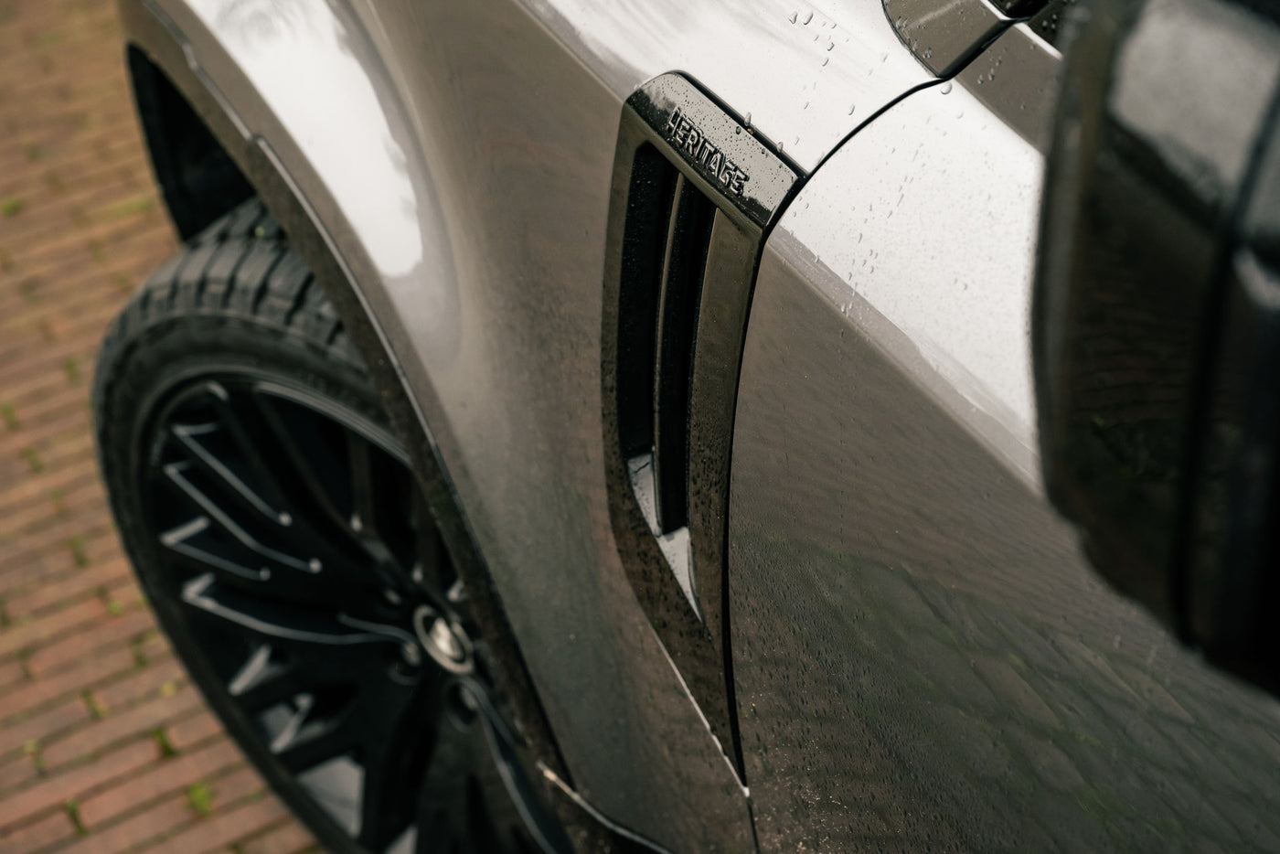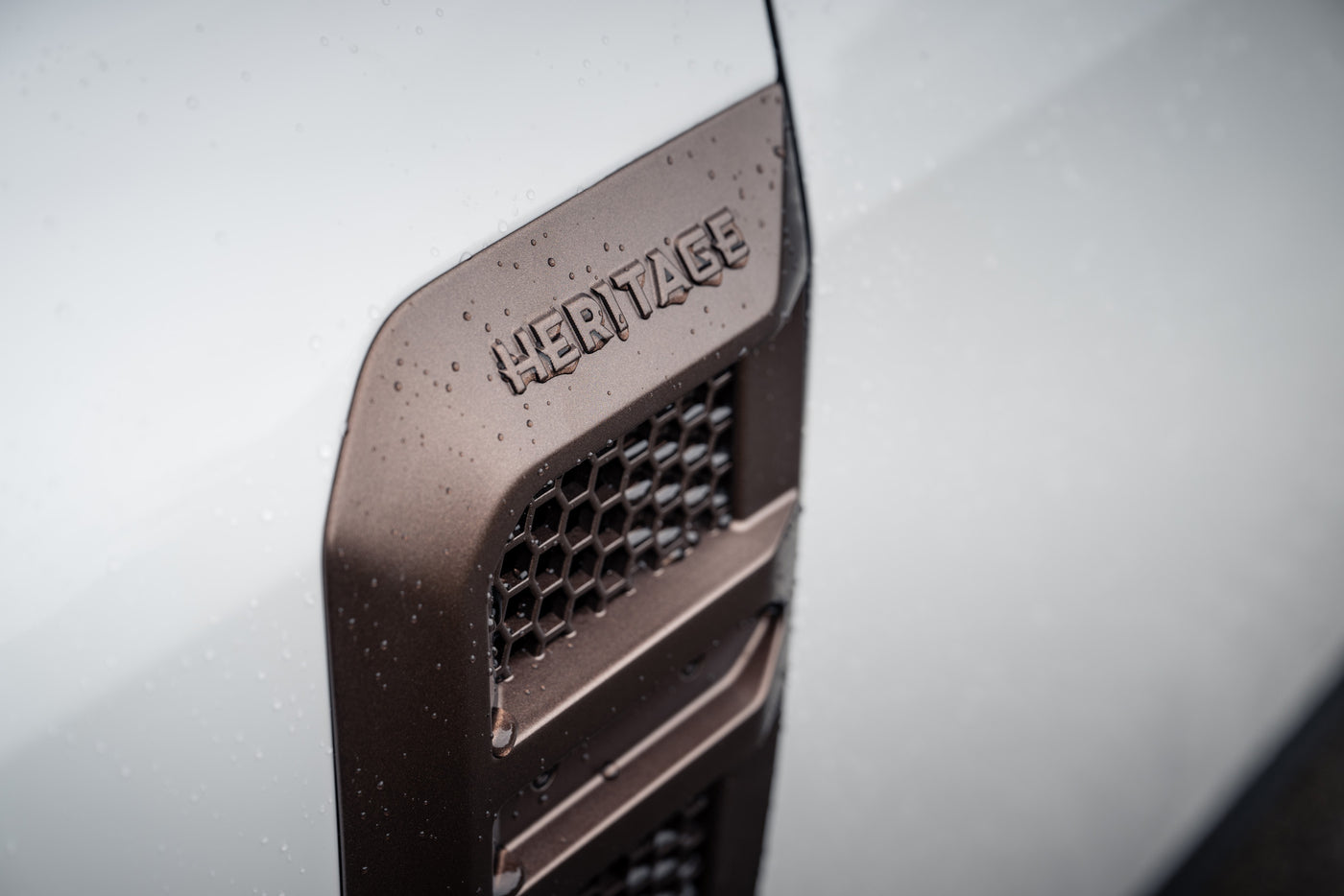 The in-house designed sporty Dynamic Line side vents, vertically oriented for maximum aerodynamics and cooling efficiency, add a touch of sophistication to the Defender's design. They feature the Heritage Customs script on the top facet.