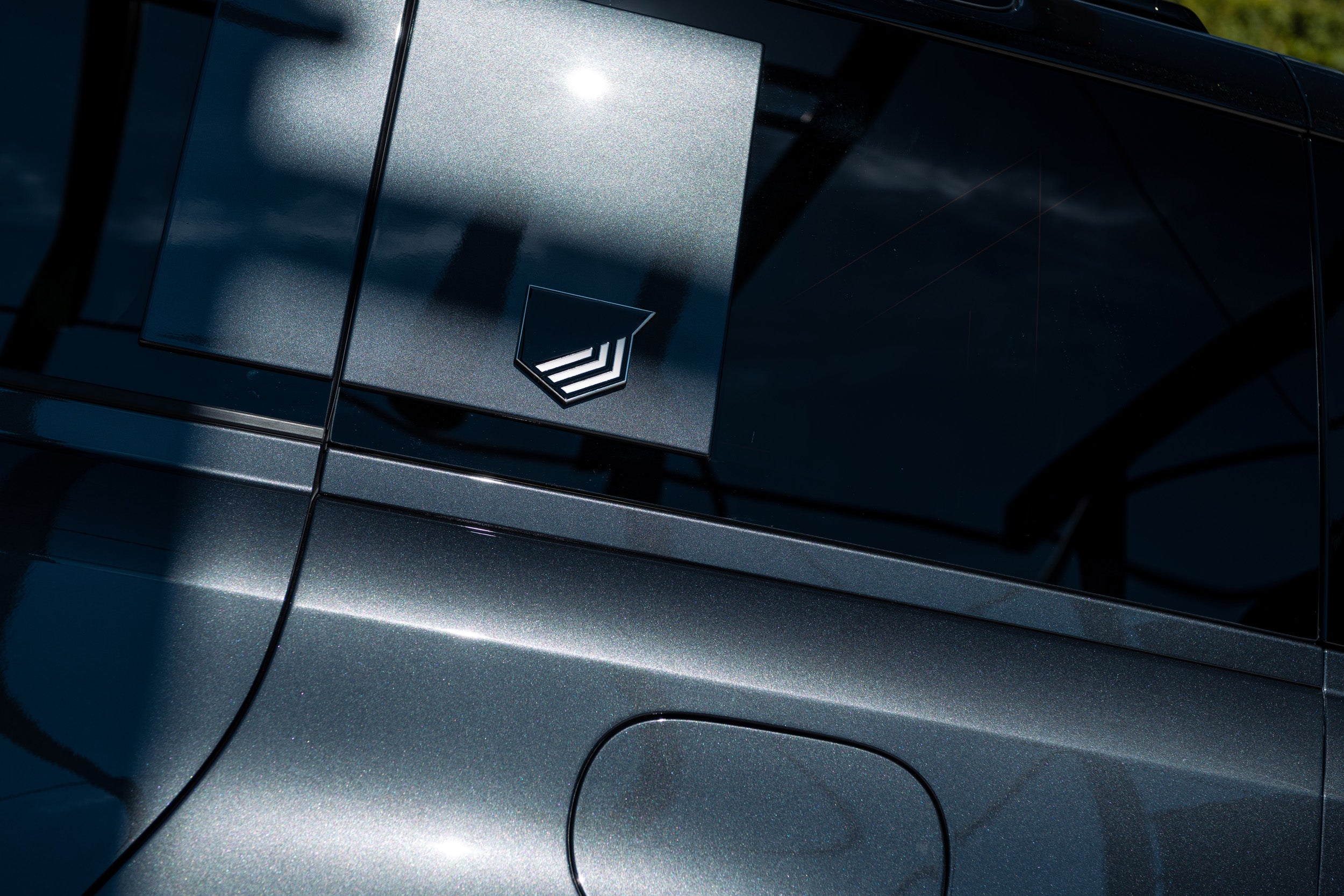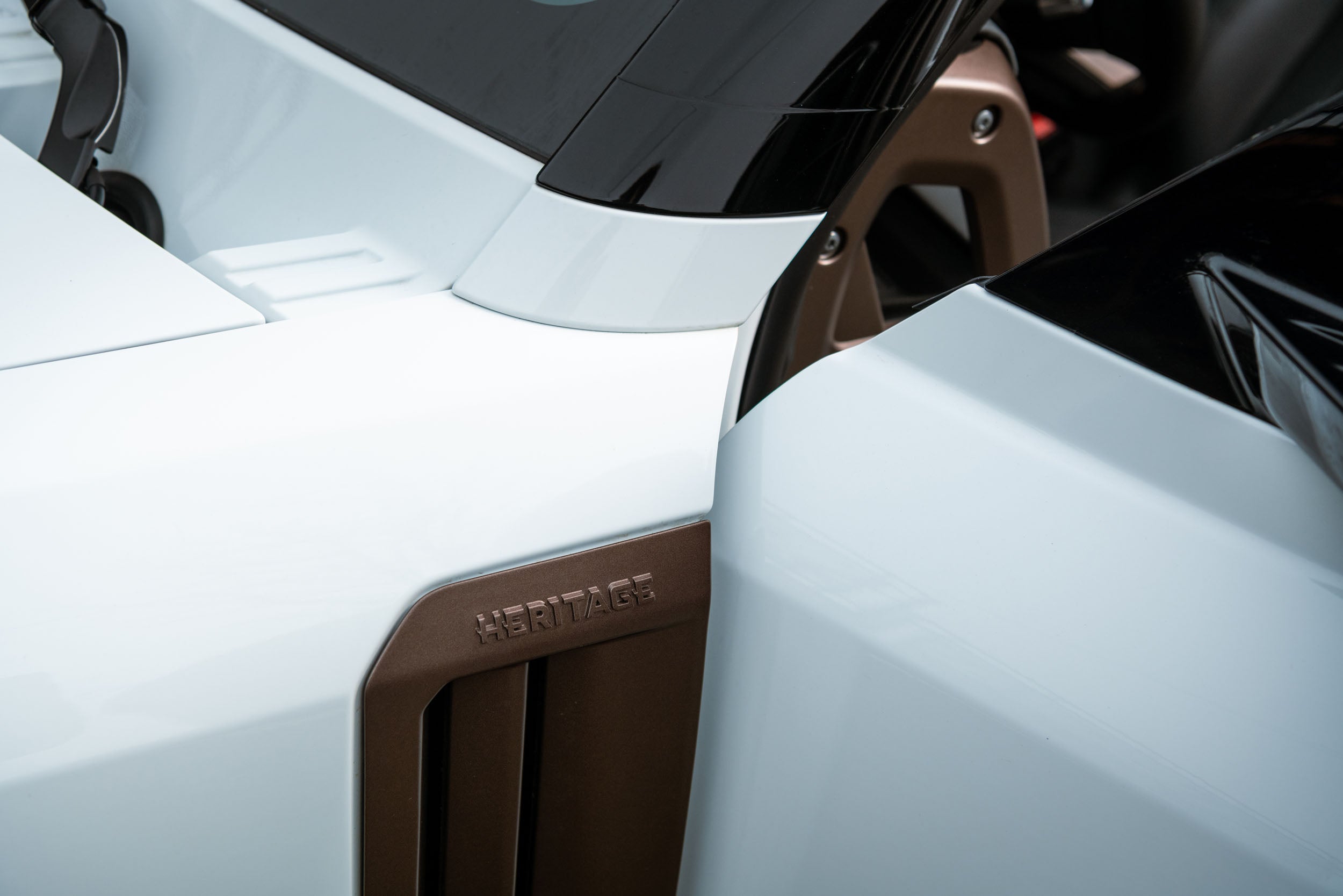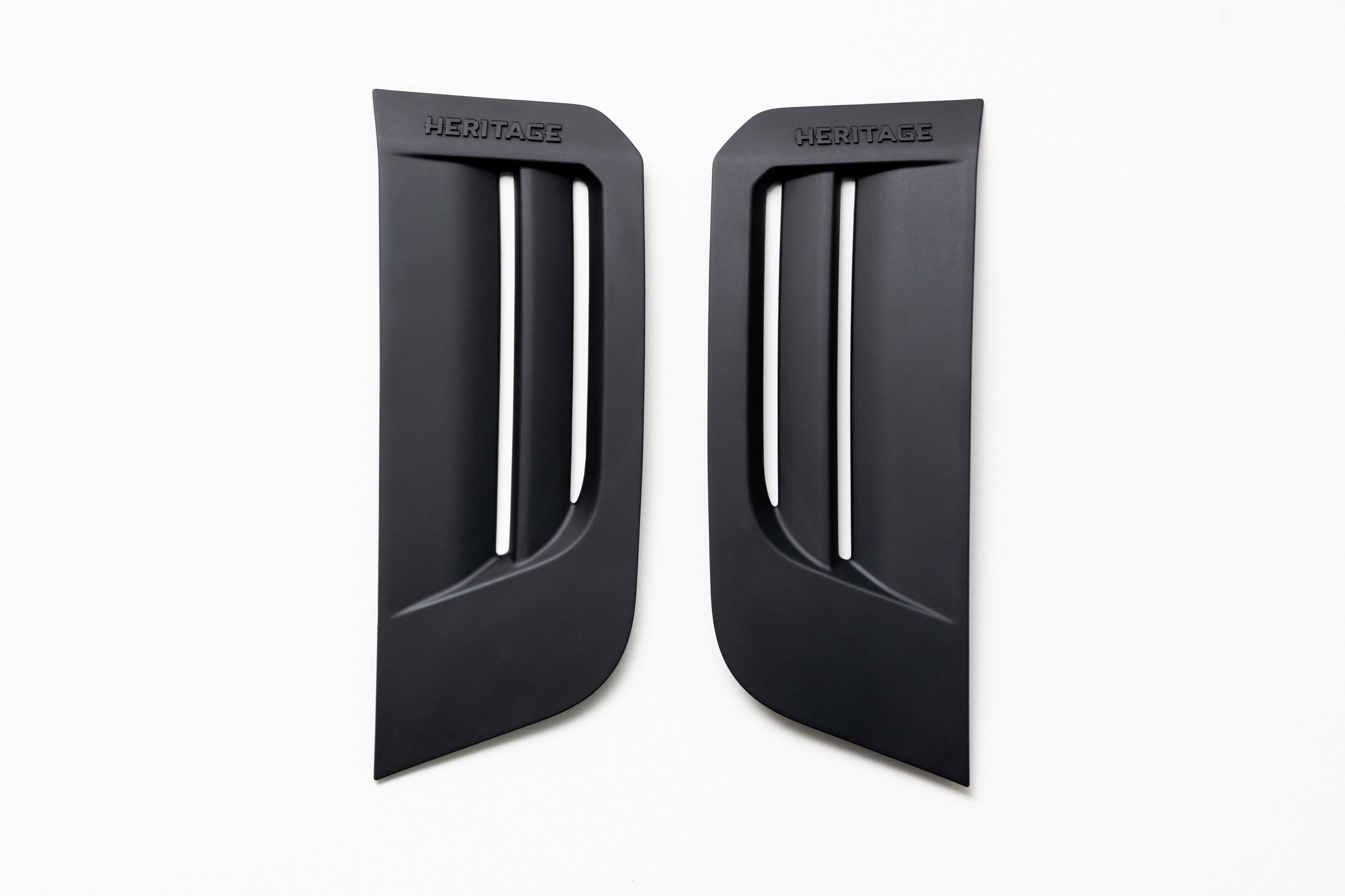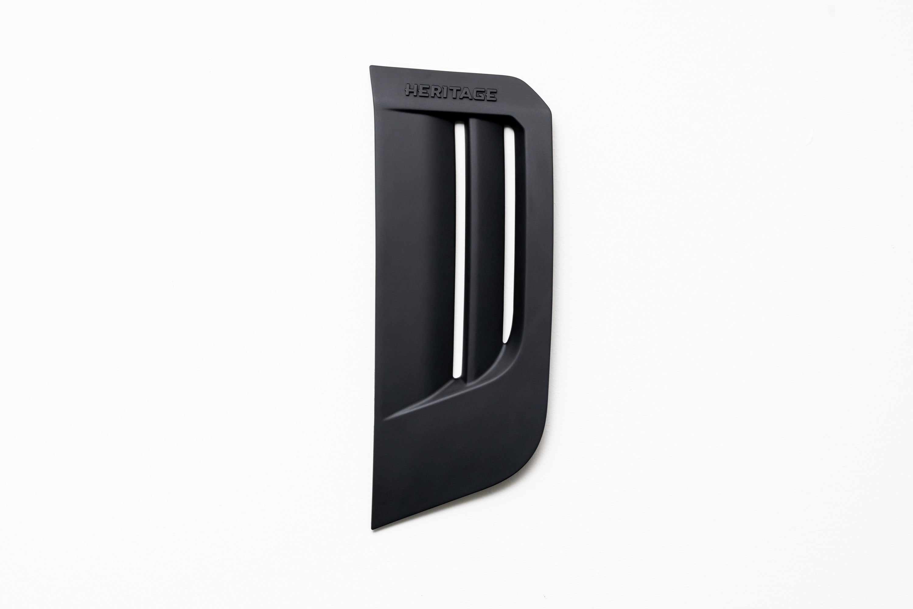 The in-house designed sporty Dynamic Line side vents, vertically oriented for maximum aerodynamics and cooling efficiency, add a touch of sophistication to the Defender's design. They feature the Heritage Customs script on the top facet.